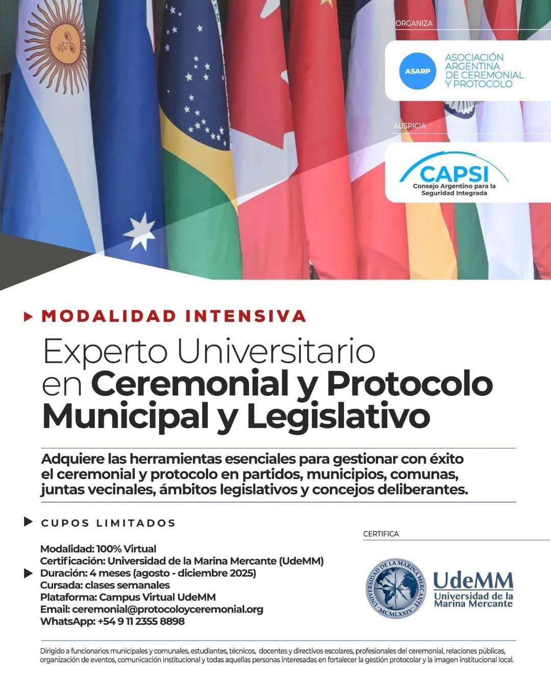 Es un honor darles la bienvenida a esta propuesta académica única en su tipo en la República Argentina, especialmente diseñada para responder a las demandas crecientes de profesionalización en el ámbito del ceremonial y protocolo municipal.